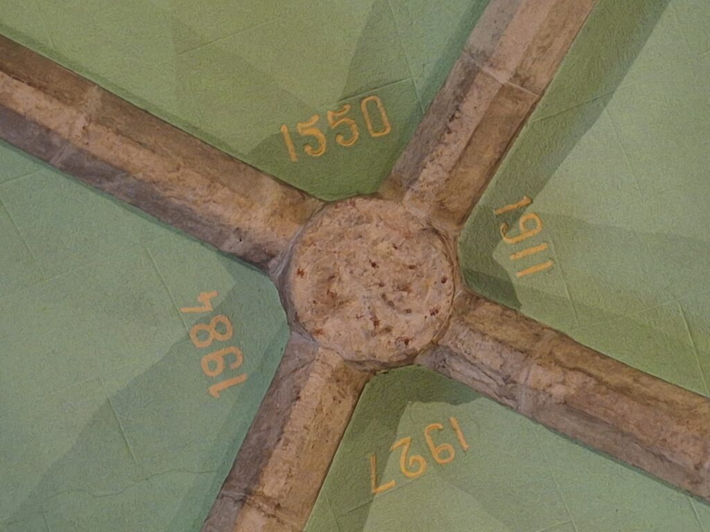 Algú va decidir utilitzar la segona volta de creueria gòtica per marcar quatre dates significatives: 1550 / 1911 / 1927 / 1984. Entrem a l’església i la mirada es dirigeix cap al sostre. Quatre dates, quatre reformes, quatre intervencions que han merescut deixar la seva empremta a la volta de la capella de Sant Romà. Què volen dir?