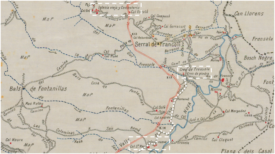 Mapa planimètric Santa Maria de Miralles (detall Sant Romà) i camí, del 1914. Font: ICGC
