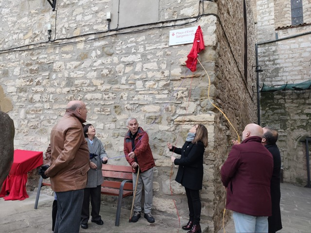 Inauguració de la plaça a càrrec dels nets de Sangenís i l’alcaldessa de Calaf, Montse Mases.